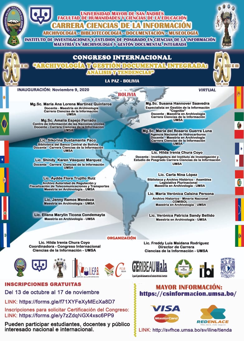 La Carrera de CIENCIAS DE LA INFORMACIÓN: Archivología, Bibliotecología-Documentación y Museología de la Facultad de Humanidades y Ciencias de la Educación-UMSA, La Paz - Bolivia.
