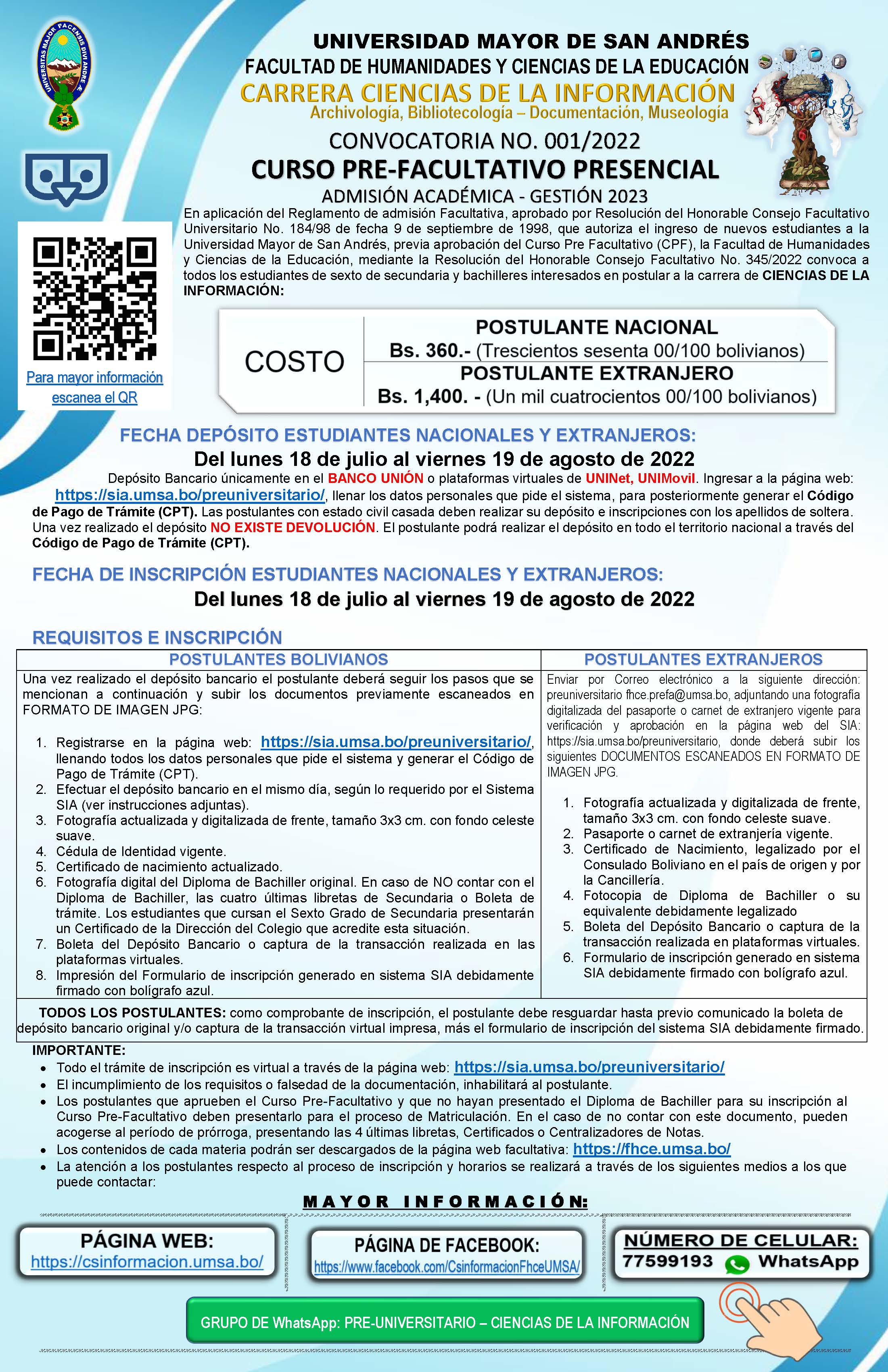 CONVOCATORIA CURSO PRE - UNIVERSITARIO - CARRERA CIENCIAS DE LA INFORMACIÓN
